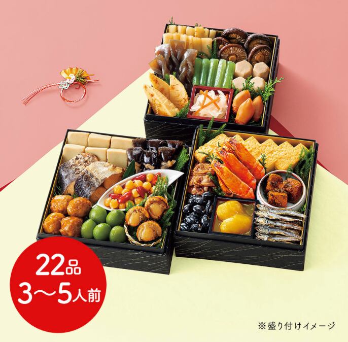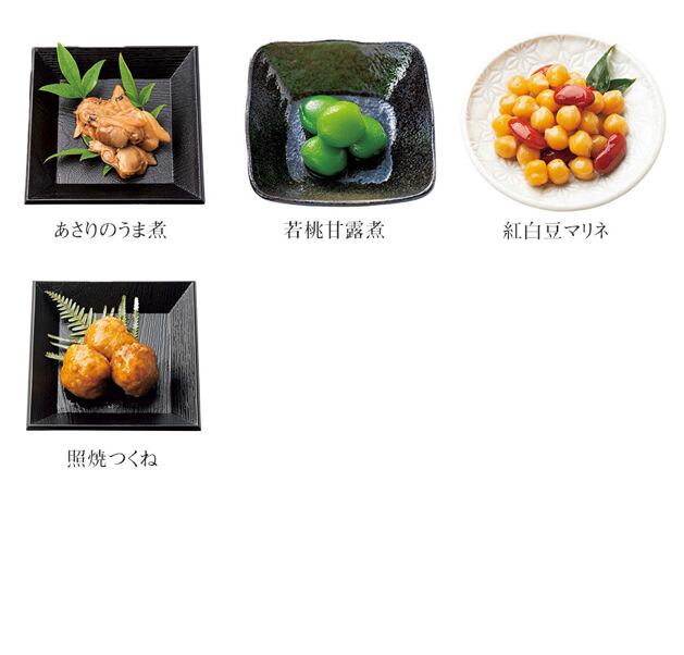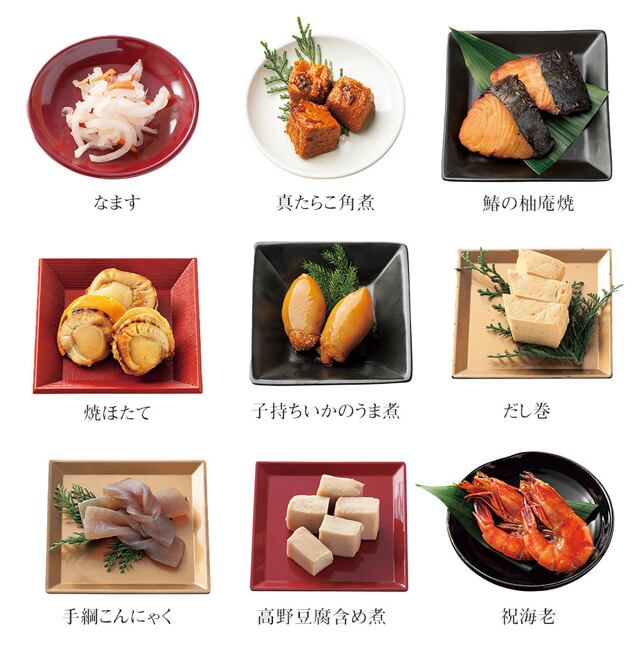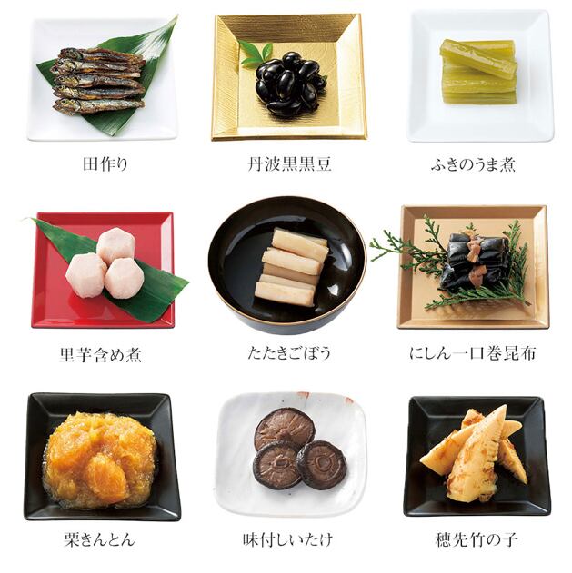 田作り(20g)、丹波黒黒豆(60g)、ふきのうま煮(50g)、里芋含め煮(4個)、たたきごぼう(70g)、にしん一口巻昆布(6本)、栗きんとん(70g)、味付しいたけ(5枚)、穂先竹の子(3切)、なます(50g)、真たらこ角煮(70g)、鰆の柚庵焼(2切)、焼ほたて(小)(3個)、子持ちいかのうま煮(3個)、だし巻(150g)、手綱こんにゃく(4切)、高野豆腐含め煮(6切)、祝海老(3尾)、あさりのうま煮(60g)、若桃甘露煮(5個)、紅白豆マリネ(65g)、照焼つくね(60g)