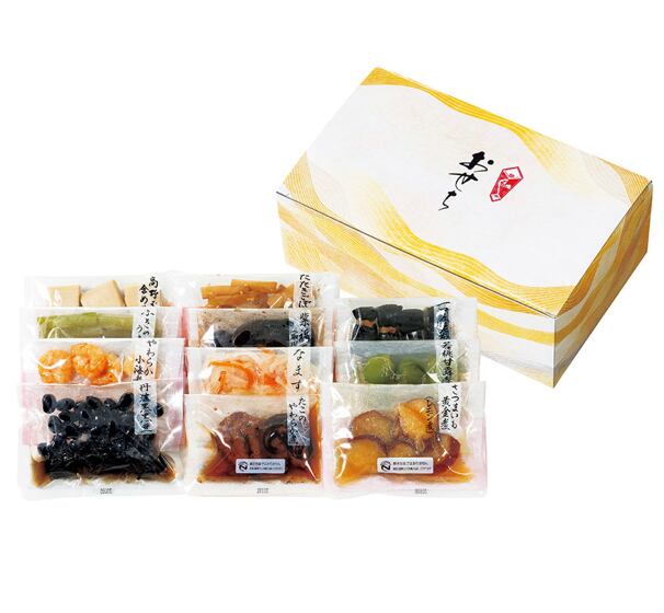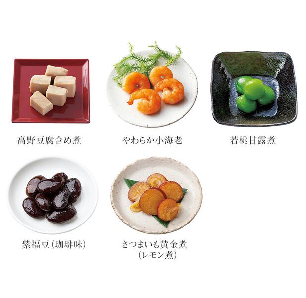 丹波黒黒豆(60g)、ふきのうま煮(50g)、たたきごぼう(70g)、一口巻昆布(6本)、なます(50g)、たこのやわらか煮(50g)、高野豆腐含め煮(6切)、やわらか小海老(4尾)、若桃甘露煮(5個)、紫福豆(珈琲味)(75g)、さつまいも黄金煮(レモン煮)(80g)