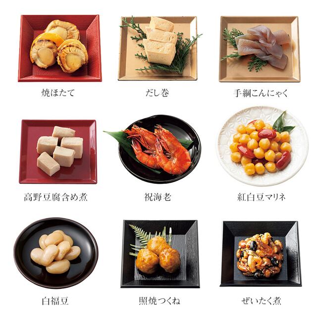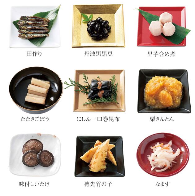 田作り(20g)、丹波黒黒豆(60g)、里芋含め煮(3個)、たたきごぼう(70g)、にしん一口巻昆布(6本)、栗きんとん(70g)、味付しいたけ(3枚)、穂先竹の子(3切)、なます(50g)、焼ほたて(3個)、だし巻(150g)、手綱こんにゃく(3切)、高野豆腐含め煮(6切)、祝海老(2尾)、紅白豆マリネ(65g)、白福豆(75g)、照焼つくね(60g)、ぜいたく煮(50g)