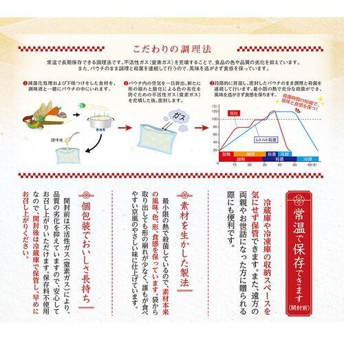富貴ごぼう(50g)、金柑甘露煮(70g)、栗の甘露煮(2個)、たこのやわらか煮(50g)、焼ほたて(4個)、子持ちいかのうま煮(2個)、あさりのうま煮(60g)、若桃甘露煮(5個)、紅白豆マリネ(65g)、紫福豆(珈琲味)(75g)、さつまいも黄金煮(レモン煮)(80g)、海老チリソース煮(4尾)、牛肉ときのこの赤ワイン煮(70g)、とりつくね(48g)、鶏の照焼(100g)、豚の角煮(65g)