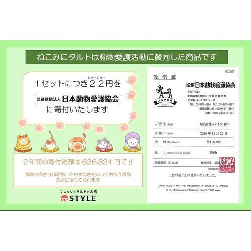 可愛い5匹のネコをあしらったミニタルトセットです。動物愛護活動に賛同した商品で、売り上げの一部(1セットにつき22円)を【公益財団法人 日本動物愛護協会】に寄付いたします。