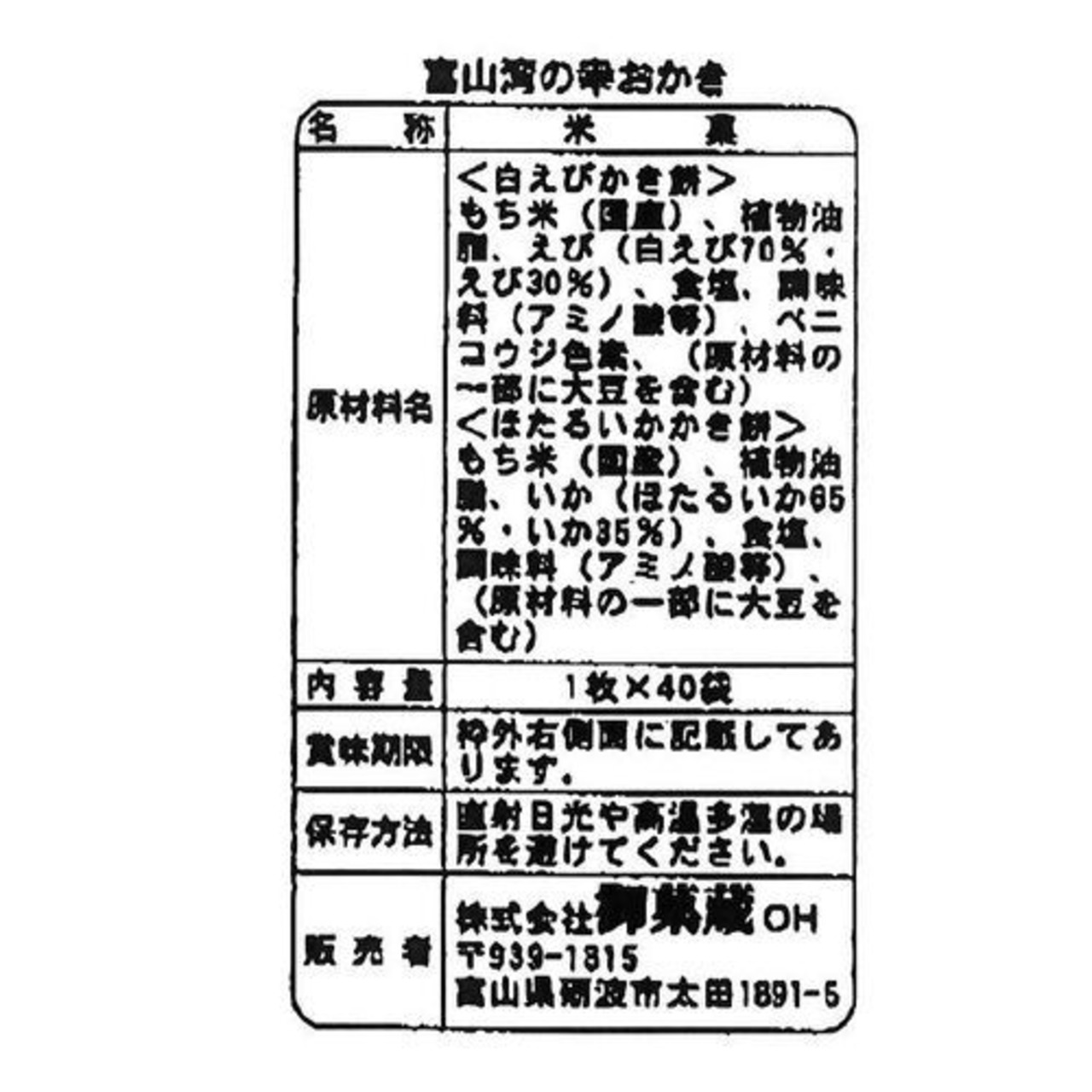 ■規格:40袋(白えびかき餅20袋、ほたるいかかき餅20袋)