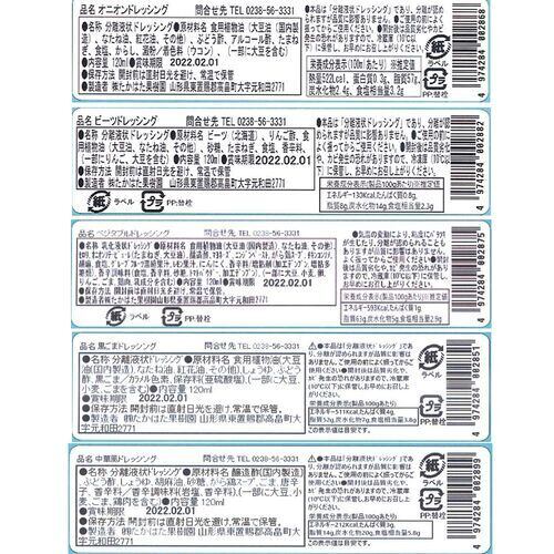 ■規格:ドレッシング120ml(オニオン、黒ごま、ベジタブル、ビーツ、中華)各1本入り