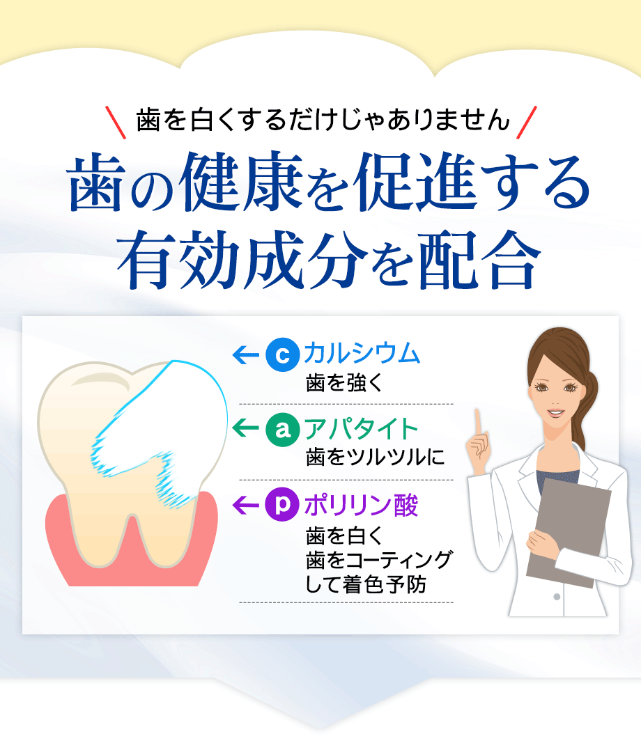全成分: エタノール、セラック、マイカ、酸化チタン、ヒドロキシプロピルセルロース、ヒドロキシアパタイト、炭酸Ca、ポリリン酸Na