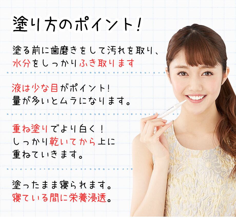 使用上の注意:★カレー等の色の強い食事をすると着色する場合があります ★グロスだけで歯磨き効果があるものではありません。毎日の歯磨きは忘れずに。 ★本品にはアルコールが配合されています。アレルギーのある方は使用をおやめください。 ★口腔内に傷やはれ等の異常がある時、知覚過敏の方はお使いにならないでください ★歯以外に使用しないでください。 ★銀歯やレジン歯には使用しないでください。 ★歯からマニキュアを落とす際は、爪用の除光液やアルコール等は絶対に使用しないでください。